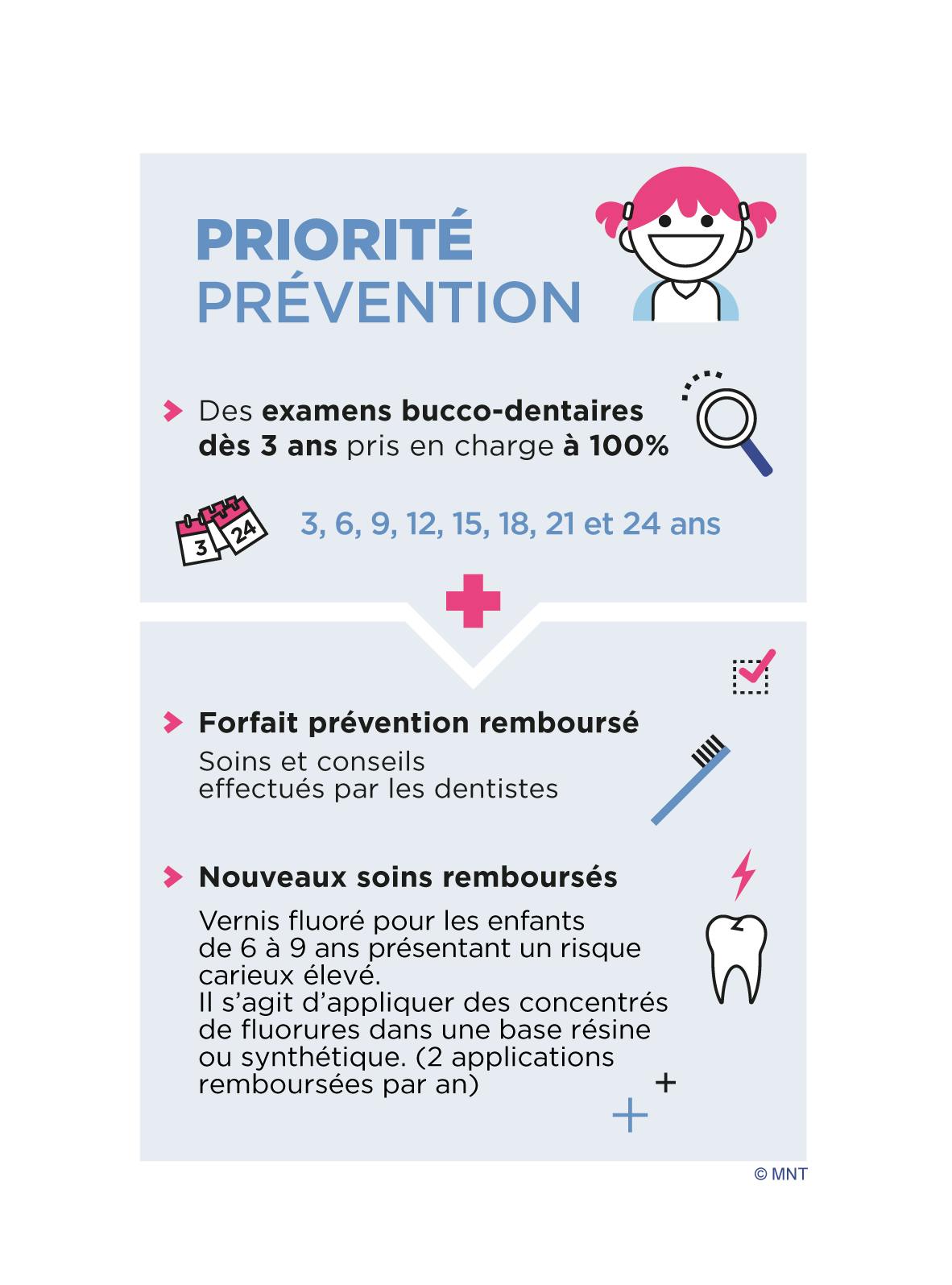 Dans le cadre du programme M’T dents, l’Assurance maladie obligatoire prend déjà en charge à 100 % les examens de dépistage, et les soins dentaires qui en découlent, pour les enfants et les jeunes de 6 à 24 ans. Deux nouveautés sont introduites à partir du 1er janvier 2020 avec la réforme du 100 % Santé :