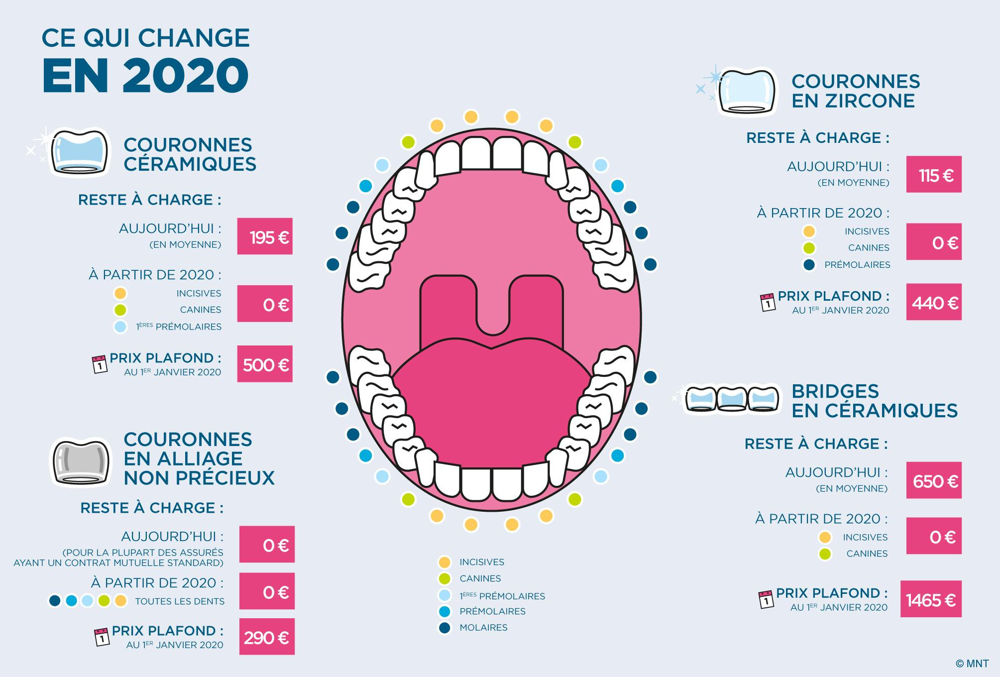 Reste à charge pour une couronne en zircone (nouveau matériau blanc, plus résistant). Pour une prémolaire, une canine ou une incisive : plafonnée à 440 € dans le panier 100 % Santé, vous n’aurez aucun reste à charge, alors qu’il est aujourd’hui en moyenne de 115 €. Pour une molaire : plafonnée à 440 € dans le panier maîtrisé, vous serez couverts à hauteur de votre garantie. - Couronne en céramo-métallique