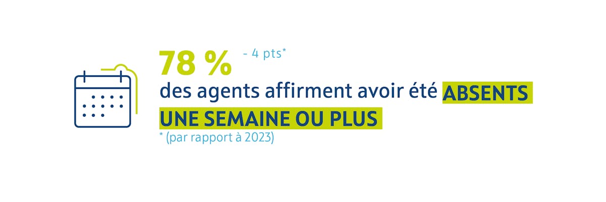 Pour 2024, l'impact négatif du travail sur la santé des agents connaît un ralentissement (42 % contre 45 % l’an dernier et 51 % en 2022). Le baromètre révèle notamment une légère amélioration, depuis 2017, de l’impact du travail sur l’alimentation des agents et les rythmes de vie. 74 % disent ainsi avoir trouvé un meilleur équilibre entre vie personnelle et vie professionnelle (68 % en 2014). Des résultats qu’il importe de nuancer : pour plus de la moitié des agents, le sommeil est en effet encore impacté par leur travail, non sans lien avec la pression et le stress toujours élevé. Et si les arrêts de travail sont moins nombreux, ils sont en revanche plus longs. Ce qui confirme l’importance pour les collectivités de mettre en place des actions en matière de santé et de prévention, qui soient adaptées aux besoins de leurs agents pour améliorer leur bien-être.