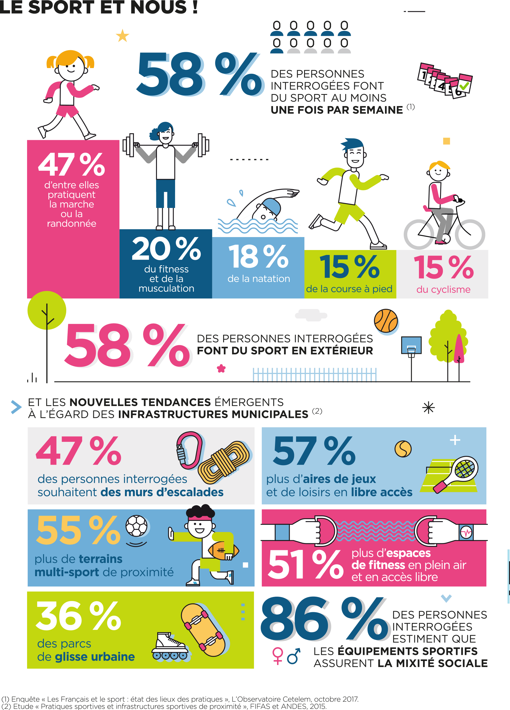 Sources : étude « Pratiques sportives et infrastructures sportives de proximité », FIFAS et ANDES, 2015. Enquête « Les Français et le sport : état des lieux des pratiques », L’Observatoire Cetelem, octobre 2017.