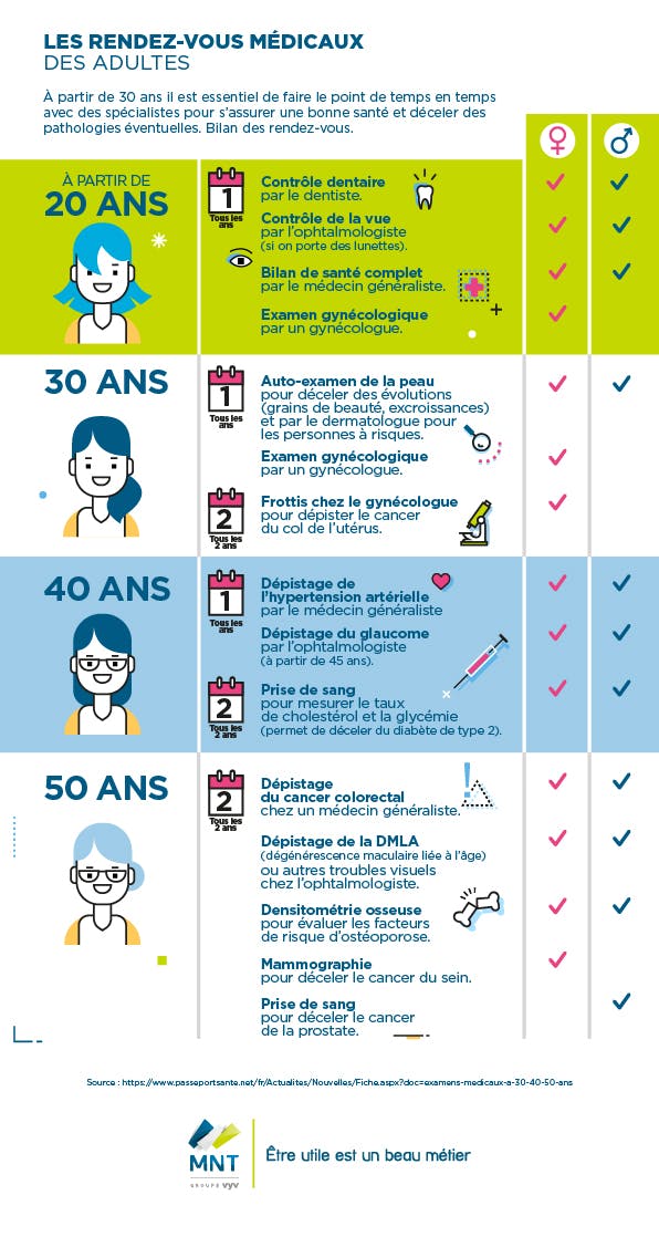 Les dents et la vue se contrôlent chaque année chez un spécialiste et ce, dès 20 ans. La pression artérielle pour dépister une éventuelle hypertension doit, elle, être prise au moins une fois par an à partir de 40 ans. Les taux de cholestérol et de glycémie seront également à contrôler.