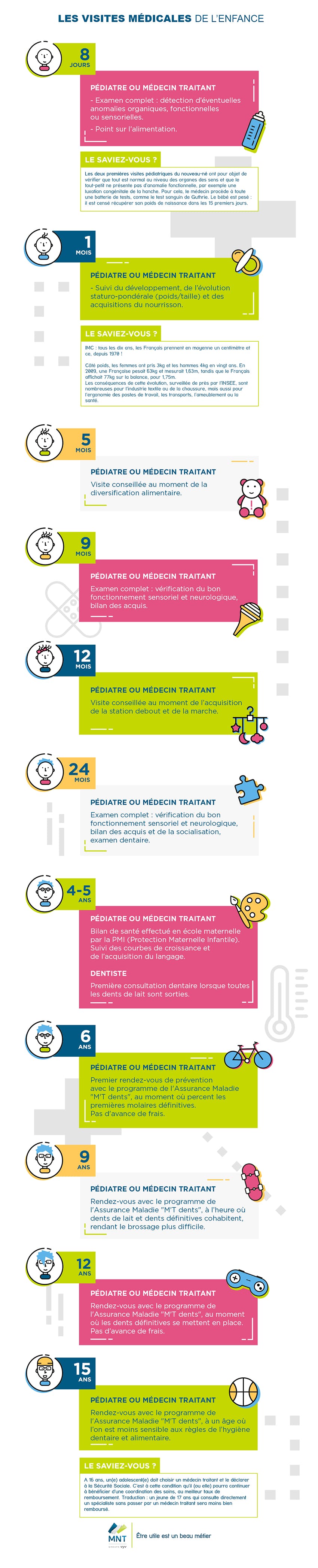 De façon générale, il est recommandé de faire examiner un enfant par un pédiatre ou un médecin généraliste une fois par mois durant les 6 premiers mois, puis à raison de deux consultations annuelles jusqu’à 6 ans et d’une visite de contrôle par an jusqu’à 18 ans. Certaines de ces visites sont obligatoires et donnent lieu à un certificat médical quoi doit être envoyé à la Protection Maternelle et Infantile (PMI) du secteur et à la Caisse d’allocations familiales (CAF) : c’est le cas des examens du 8ème jour, du 9ème mois et du 24ème mois.