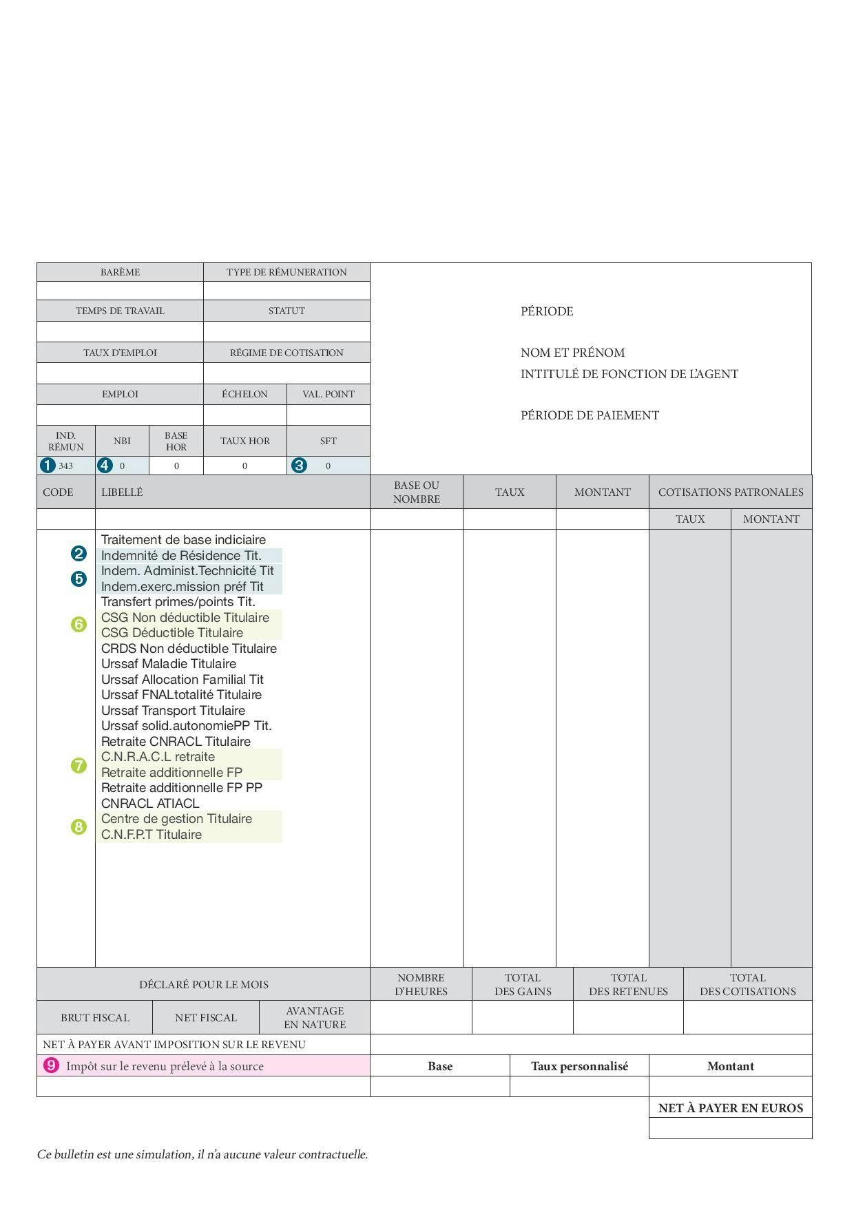 Les cotisations patronales à la charge de l’employeur – retraite (RAFP), invalidité (ATIACL), Centre de Gestion, Formation (CNFPT) – sont mentionnées à titre d’information sur le bulletin de paie.